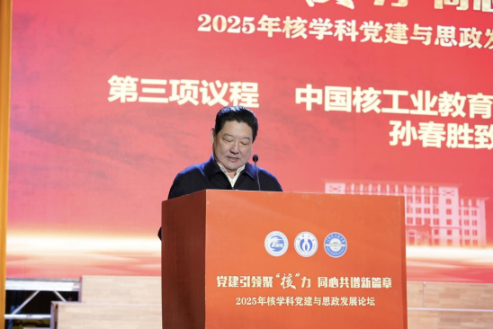 孙春胜在致辞中代表学会对论坛召开表示热烈祝贺,对南华大学的精心筹备表示感谢。他指出,本次论坛恰逢“十四五”收官与“十五五”谋划的关键节点,是深化党建与核学科融合发展的生动实践。他强调党建是核事业行稳致远的根本保证,期待与会同仁深入交流,以党建“红”引领核业“兴”,并表示学会将继续发挥平台优势,全力支持核学科高质量发展。