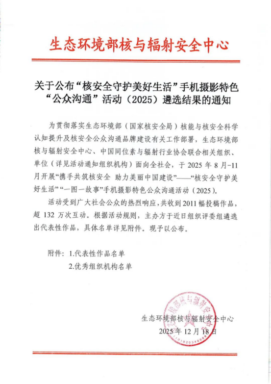 近日,由生态环境部核与辐射安全中心、中国同位素与辐射行业协会联动相关组织、单位组织开展的“携手共筑核安全 助力美丽中国建设”——“核安全守护美好生活” 圆满落幕,南华大学在本次活动中获评“优秀组织机构”。