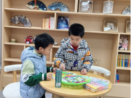 走进学院216阅读室,各类棋具整齐摆放,象棋、围棋、五子棋、飞行棋一应俱全,小朋友们或凝神对弈,或结伴切磋,在方寸棋盘间锻炼思维、收获友谊。隔壁的乒乓球室同样热闹非凡——跳绳、羽毛球、跑步机等体育器材准备充足,孩子们挥拍跳跃,尽情释放活力。分工会还特别准备了“拼豆”手工材料,五彩缤纷的豆子在孩子们手中变成各种可爱的图案,专注创作的模样格外动人。活动期间,院团委每天安排多名学生志愿者轮流值守,化身“大朋友”陪伴小朋友们。志愿者们耐心指导棋类规则,带领孩子们进行趣味体育比赛,还共同阅读科普绘本,分享核科学小故事。一幕幕“拼拼豆、下下棋、看看书、打打球”的画面,洋溢着温馨与欢笑,成为春假校园里一道亮丽的风景线。