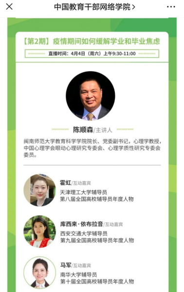本期直播活动由闽南师范大学教育科学学院院长陈顺森教授主讲。陈教授以“疫情期间如何缓解学业和毕业焦虑”为主题,进行了深入细致、全面详细的讲解。南华大学辅导员马军老师受中国教育干部网络学院的邀请,参加了本期直播线上答疑活动,与全国高校辅导员学员进行了在线互动交流,并获得了好评。