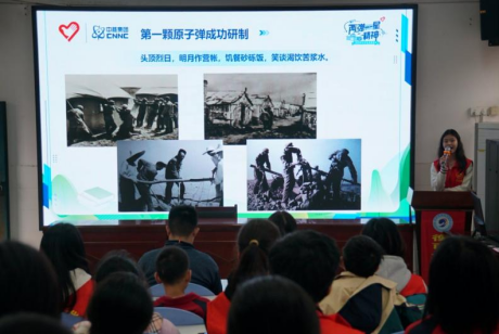 演讲从一块名为“开业之石”的铀矿石讲起,牟馨然用一系列珍贵的历史影像,为孩子们铺开了一幅新中国核事业自力更生、艰苦创业的壮丽画卷。她从这块不起眼的石头如何点燃中国核事业的“星星之火”娓娓道来,引领孩子们走进那段激情燃烧的岁月。