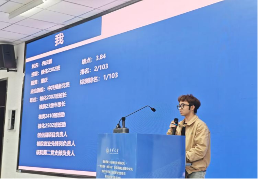 来自核化2302班的冉庆鹏同学,出身寒门,初中时成绩并不理想,但他始终坚信“只要我有能力,我就一定能追上”。从确立目标到脚踏实地奋斗,他将“逆袭”二字刻入青春,用行动诠释了“寒门贵子”的真正含义。他的经历告诉在场同学:人生没有定局,奋斗方能改写命运。他的目标如灯塔,照亮前行的方向;他的故事如范本,激励着每一位同学勇于面对挫折,在大学舞台上绽放属于自己的光芒。