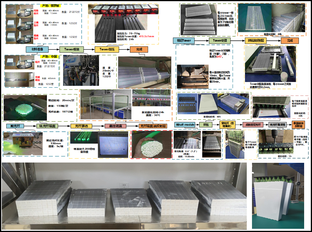 四、该论文对量能器tower和量能器模块进行了研制,完成了南华大学所承担的77个模块的制作和加工任务;该论文总结了电磁量能器tower和量能器模块的制作工艺和参数。筛选闪烁体片和铅片进行堆叠和加压,利用剥线机对波长位移光纤进行剪切,对制作好的半成品tower以及光纤的端面进行反射层涂抹和点胶工作,将16根光纤贯穿地插入tower中预留的16个小孔中,并使用铝板进行集束固定,对固定住的端面再进行打磨处理,最终制作成量能器模块的成品。整个过程如图4所示。