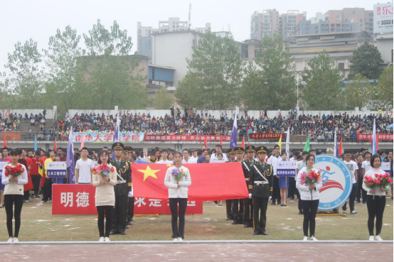 八时的钟声紧跟着秋日的清风缓缓而过,不疾不徐,随着义勇军进行曲的奏响,十二面逆风而舞的国旗向前迈出了飒爽的步伐,方阵入场仪式也就正式开始。国旗队、会徽队、彩旗队、鲜花队等方阵与各学院的代表队一一而至,无不展现其巍巍英姿,彰显其熊熊气概,令人叹止。接着,副校长致开幕辞,并弘扬体育强国的观念,其言慷慨激昂,振聋发聩,鼓舞人心,吾辈无一不深知其义,倍感驱策,必将秉承其训,身体力行。最后,裁判员与运动员代表一一于主席台做出庄严宣誓。